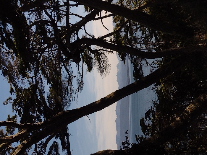 Framed by moss-draped trees, a glimpse of the Pacific Ocean unfolds