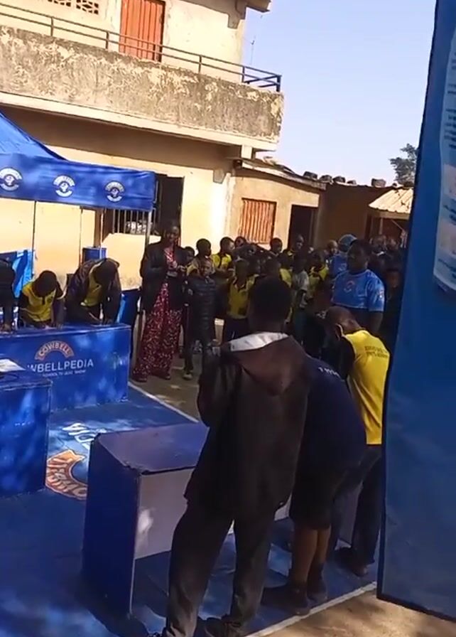 The video captures an outdoor event, possibly at a school, featuring a crowd of students and adults. The majority of the students are wearing yellow and black uniforms. There are a few blue tents with branding visible. The students are gathered around a table, potentially participating in an activity or competition. The backdrop includes a multi-story building and a gate with writing on it. The atmosphere appears to be lively and engaging.