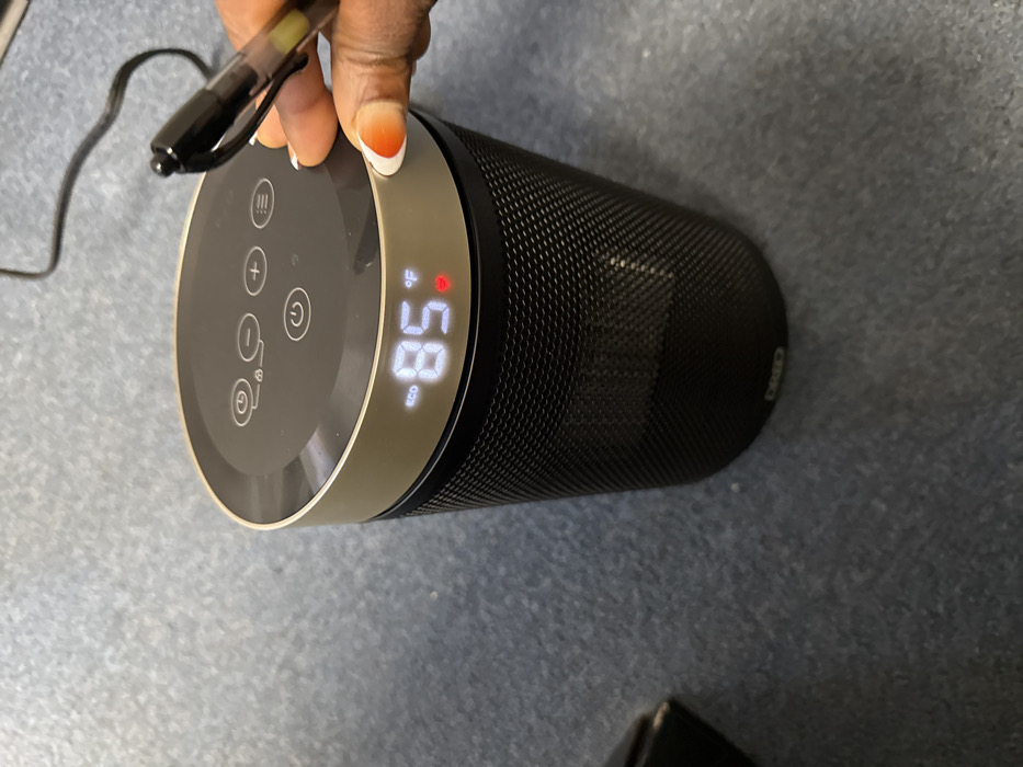 - "The image displays a black cylindrical portable space heater with a perforated grille, positioned on a dark gray carpeted floor in Loganville, United States" by FM-AodXs2, licensed under CC BY 4.0