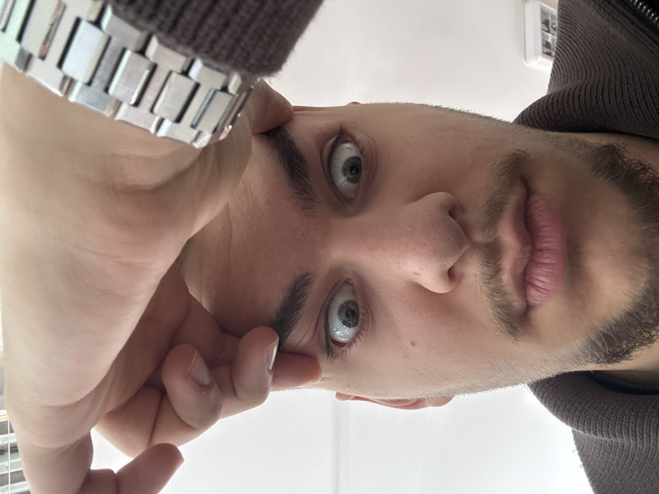 A close-up, head-and-shoulders portrait depicts a male subject in an indoor location in Sofia, Bulgaria. The subject, appearing to be a young adult with light-colored, wide-open eyes and a pouting or puckered mouth, directly faces the camera. His facial expression is exaggerated, with eyebrows and forehead skin visibly pulled upwards by a hand positioned at the top of his head. The hand, likely belonging to the subject, wears a silver-toned metallic link watch on its wrist, which is partially obscured by a brown, ribbed sleeve. The subject has a mustache and a goatee. The background is predominantly light-colored and out of focus, with a partial view of a white rectangular ceiling light fixture visible in the lower right portion of the image.