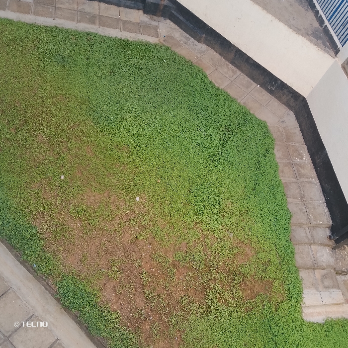An aerial view depicts a patch of grass bordered by concrete pavers and a building. The grass, predominantly green, has some sparse, dry areas exposing the soil. The building's white exterior is trimmed with black paint along the edge where it meets the pavers. A fence is visible in the upper right corner.
