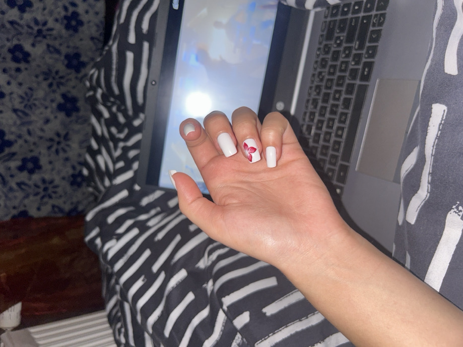 The specific city location of Strasbourg, France, is not ascertainable from the visual information provided in this indoor scene. The image presents a close-up, first-person perspective focusing on a human left hand and forearm. The hand exhibits light-toned skin, with all visible fingernails painted white. A red floral design, consistent with a stylized hibiscus, is present on the ring fingernail. The middle fingernail shows a minor chip or defect on its left lateral edge. The hand rests above the keyboard of a dark-colored laptop computer. The laptop's screen is illuminated, displaying blurry imagery with bright highlights and indistinct forms, consistent with video playback. The individual is covered by a black and white abstract striped blanket or bedding. In the background, behind the laptop, a blue fabric with a white floral pattern is visible, along with a blurred reddish-brown object to the upper left. The overall lighting is dim, with the laptop screen serving as a primary light source.