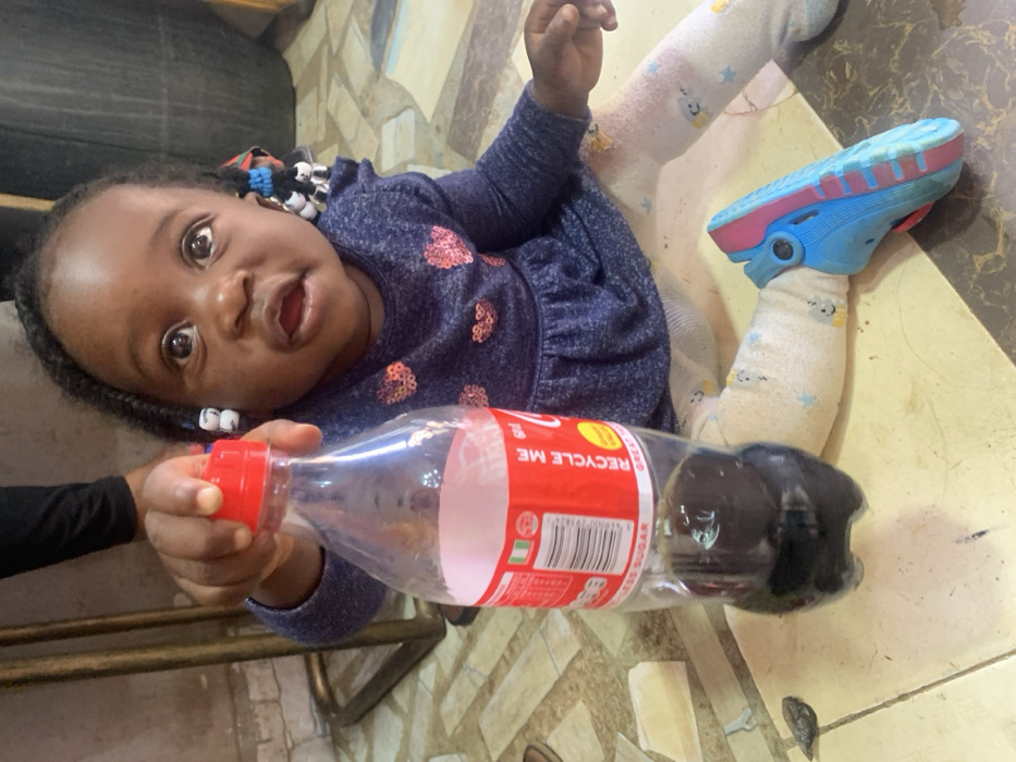 This image depicts an infant seated on a tiled floor in Kabong, Nigeria
