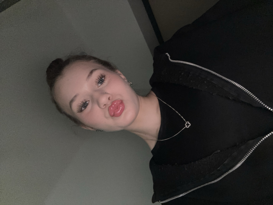 A young woman with light skin and brown hair pulled back in a bun poses with pursed lips. She is wearing heavy eyelashes and subtle makeup. A silver necklace with a clover pendant rests on her black top. She is also wearing a black zip-up jacket. The background is a muted gray tone. The image is taken from a low angle, looking up at the subject.