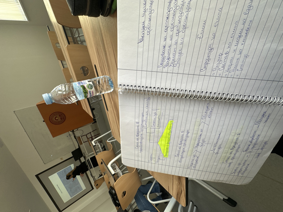 An indoor, well-lit classroom at the University of National and World Economy (UNWE) in Sofia, Bulgaria, is depicted from a student's perspective. In the foreground, an open spiral-bound notebook with handwritten Bulgarian notes, some highlighted in yellow, rests on a light wooden desk. A clear plastic water bottle, labeled "Guarana," stands upright on the desk to the right of the notebook. A black zippered case is partially visible on the far right. Partial view of blue-jean-clad legs is seen under the desk on the left. In the midground, several rows of unoccupied light wooden desks with metal frames are visible. In the background, a female instructor in dark attire stands by a projector screen, pointing at displayed text during a lecture. A black laptop is positioned on the instructor's table. An orange-brown wooden podium bearing the UNWE logo is situated to the right of the projector screen, and a white board is mounted on the wall further right. The room features white walls and appears clean and organized.