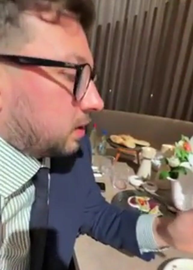 three individuals seated at a dining table in a restaurant. One man, wearing a navy suit, striped shirt, and glasses, is facing the camera and gesturing with his hand as he speaks. A couple sits to his right, with the woman wearing a red off-the-shoulder dress. Plates of food and beverages, including wine, are arranged on the table. In the background, a waiter walks past a table set with white tablecloths. The restaurant features modern decor with wooden slat walls and soft lighting.