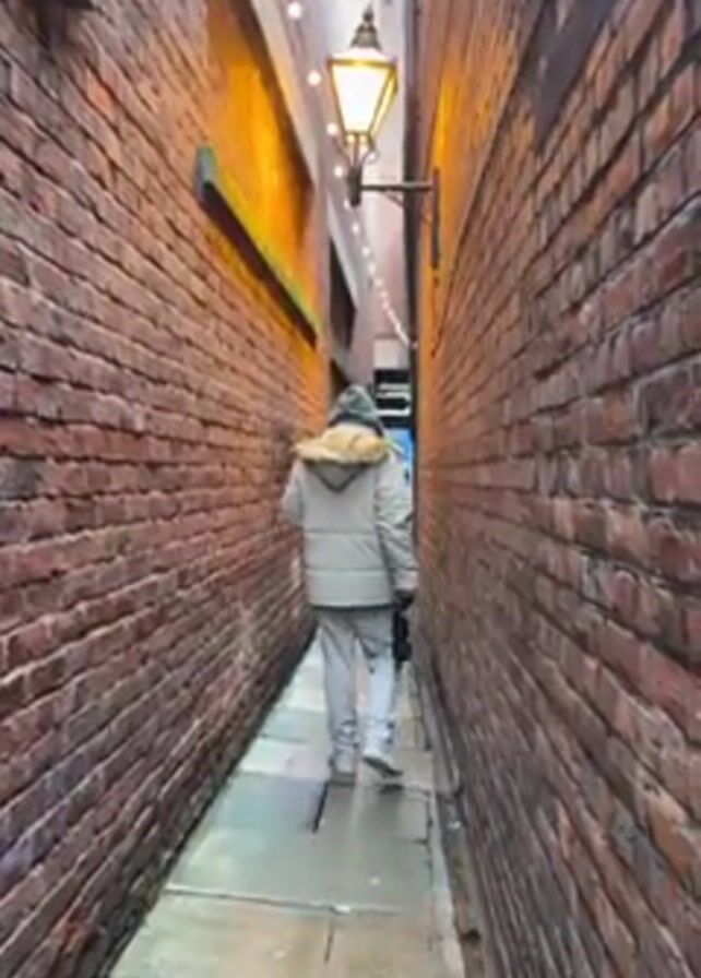 A person in a light-colored coat and pants walks away from the camera through a very narrow alleyway lined with red brick walls