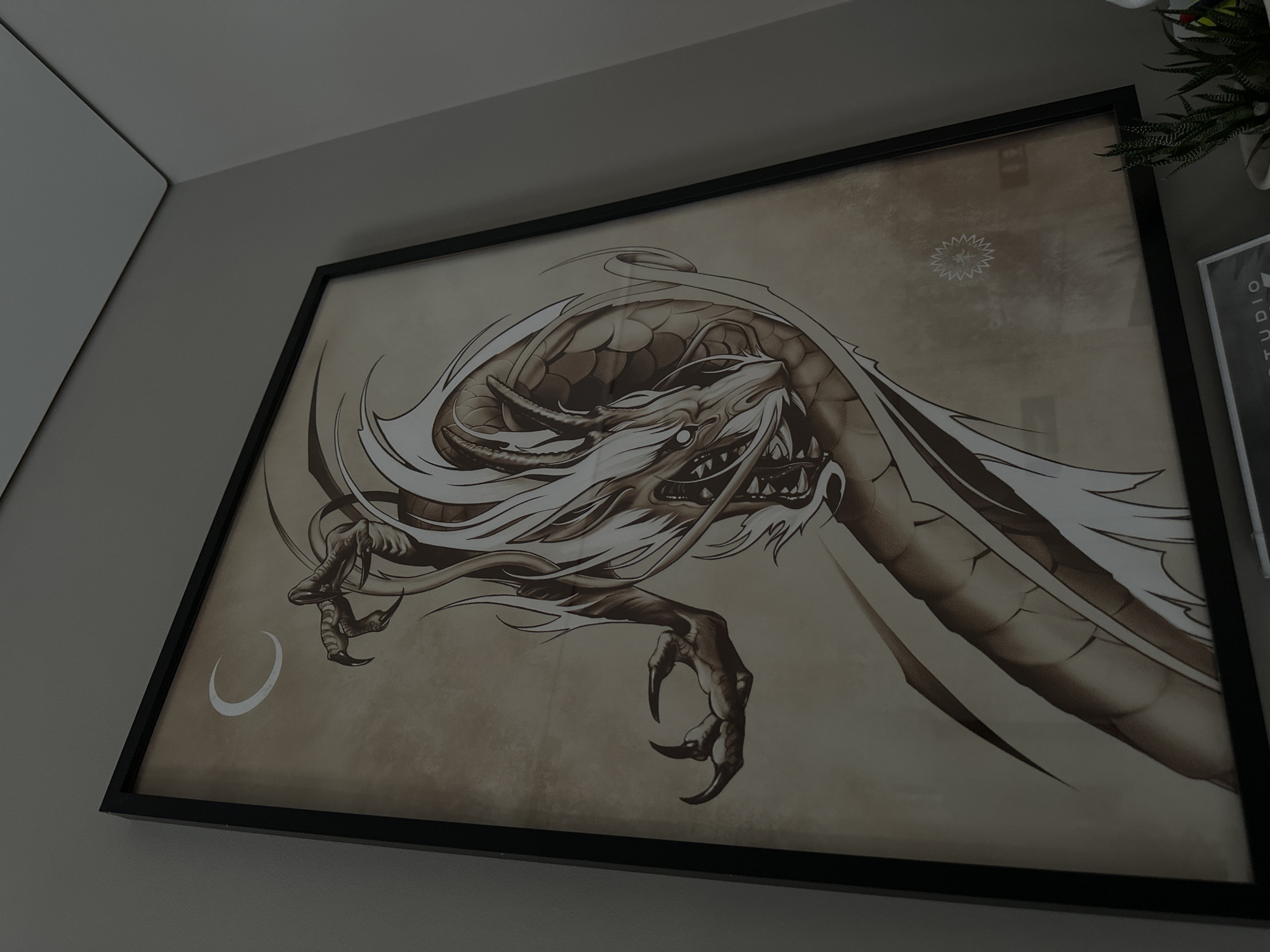 The image displays an indoor scene located in Rostov-on-Don, Russia. The primary subject is a large, vertically oriented framed artwork depicting a stylized dragon. The dragon is rendered in shades of brown and white on a light tan background, featuring prominent scales, sharp claws, and flowing white accents around its head and body. A white crescent moon is visible in the upper left corner of the artwork, and a circular, star-shaped emblem containing undecipherable symbols is situated in the lower right. The artwork is enclosed within a thin black frame and is mounted on a light gray wall, which forms an interior corner with an adjacent light gray wall. Below the framed artwork, a portion of a white rectangular sign with the word "STUDIO" in black text is visible. To its right, a small potted succulent plant with dark green, spiky leaves sits in a white container, with a small red object partially obscured behind it. No individuals are present. The environment appears to be an interior room with muted lighting.