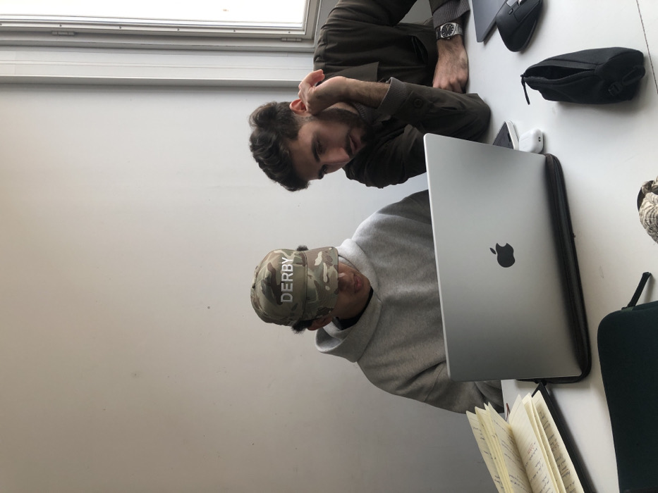 The scene takes place in an indoor setting in Paris, France, depicting two males seated at a white table. On the left, a male in a light grey hooded sweatshirt and a camouflage baseball cap with "DERBY" in white text on its front is focused on an open silver Apple MacBook laptop. His face is obscured by the cap's brim. To his right, a second male with dark hair and a beard, wearing a dark olive-green collared garment and a metallic wristwatch on his left wrist, leans forward, observing the laptop screen with his left hand near his cheek. The white table surface displays an open notebook with handwritten text to the left of the MacBook, which rests on a dark pad. To the right of the laptop are a white smartphone, white AirPods in their charging case, an open black fabric pouch, a black computer mouse, and a partially visible dark laptop or tablet. The background features a plain, light-colored wall, with bright natural light entering from a large window with a grey frame on the right side of the image.
