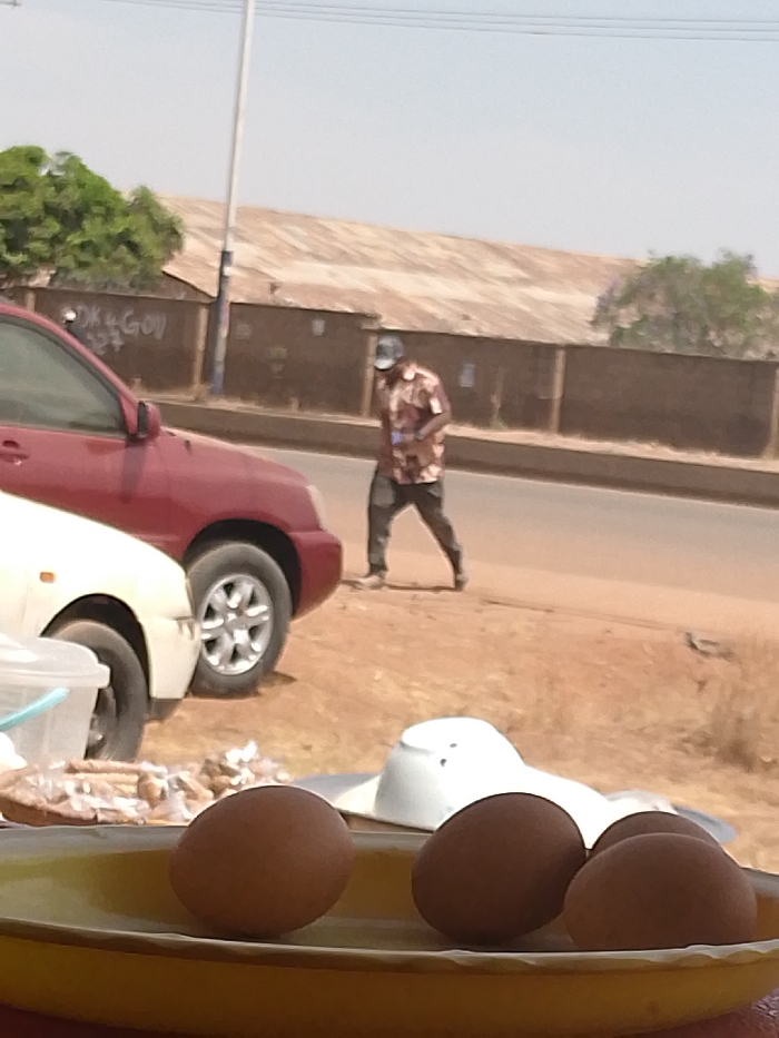 The image depicts a roadside scene in Jos, Nigeria, characterized by a dusty, arid environment under a bright sky. In the immediate foreground, an oval yellow platter holds approximately five brown eggs. Behind the platter, a white inverted bowl rests on the ground next to a clear plastic container and a pile of small, light-colored debris. To the left, the front wheel and lower section of a white car are visible. Directly behind this, a maroon-colored SUV is parked or stationary, facing left, with its front wheel visible. A paved road separates this foreground area from the background. A male individual walks from right to left on the dirt shoulder parallel to the paved road. He wears a patterned short-sleeved shirt, dark trousers, and a dark baseball cap, obscuring his face. He appears to be holding a small blue object in his left hand. Further back, a slender light-colored utility pole stands next to the road. Behind the pole and the road, a low, tan-colored fence runs horizontally, displaying faint graffiti, including the text "DK 4 GOV." Beyond the fence, several single-story buildings with weathered, light brown corrugated metal roofs are visible under a clear, pale blue sky. Sparse green foliage is present on the far left and right edges of the background. The ground throughout the visible area is predominantly dry, light brown earth or sand.
