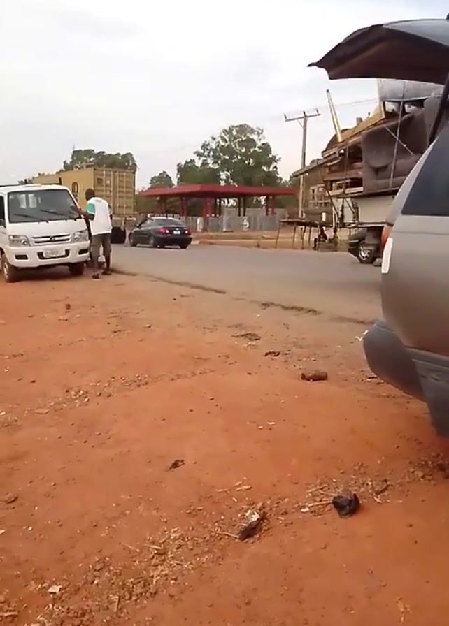 roadside scene with several vehicles and individuals present. A white pickup truck is the focal point, with two men standing near its front. One man in a light-colored shirt appears to be working on the vehicle's front bumper or hood, while another man in a green shirt stands nearby. In the background, there is a road with passing vehicles, including a black sedan and a dark SUV with items on its roof. A truck loaded with furniture is also parked along the side of the road. The foreground consists of a reddish-brown dirt area with scattered debris. The sky is overcast, creating an overall muted lighting. There are also power lines and trees in the distance.