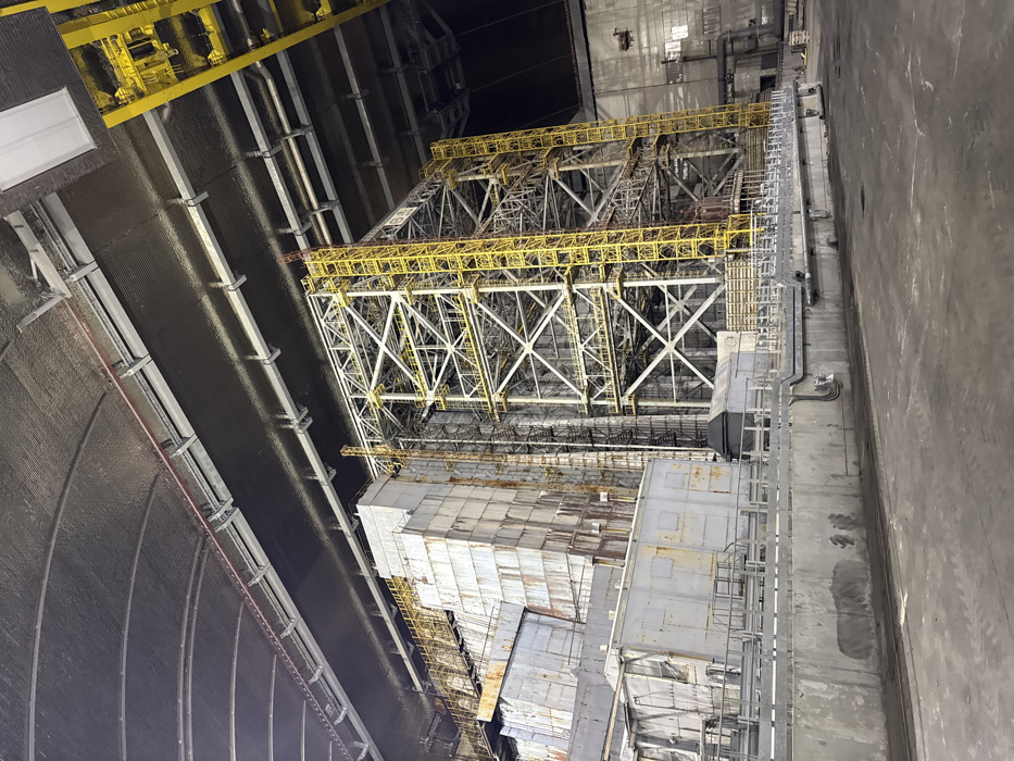 The image displays a vast industrial interior within the Chernobyl Nuclear Power Plant complex, located near Pryp'yat', Ukraine, specifically inside the New Safe Confinement (NSC) structure over Reactor 4