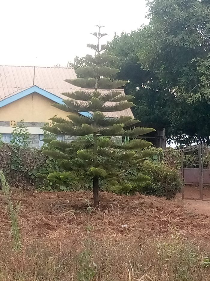 A solitary, slender evergreen tree, distinguished by its evenly spaced, horizontal branches, stands prominently. A low-lying bush separates the tree from a modest, one-story structure. The building has a light-colored siding, a tin roof, and blue trim. To the tree's right, a larger, leafy tree offers a backdrop, with a metal gate visible near the edge. The ground around the evergreen is cleared. Beyond it, dry vegetation and grasses fill the foreground. The sky is overcast.