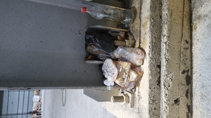 A narrow space is cluttered with trash. A plastic water bottle with a red cap lies near the top. Underneath, there's a black plastic bag and several cellophane-wrapped items, possibly food. The trash is nestled between a gray, metallic structure and a rough concrete wall, where a bolt and nut are visible. A glimpse of a metal fence and a green hose is seen in the background.