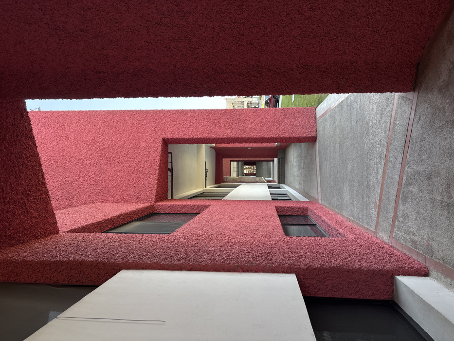 n exterior view of a modern building with a striking combination of textures and colors. The predominant color is a deep red, used on textured walls and overhead structures. Contrasting this is the smooth white of walkways and platforms. There are also sections of concrete. Rectangular openings reveal windows or doorways along the corridor. Above, a glimpse of green foliage and figures suggests an upper level. The composition emphasizes the building's angular design and the interplay of light and shadow.