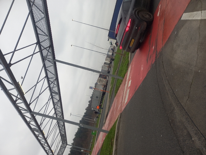 The image displays an outdoor scene in Nazareth, Belgium, under an overcast sky. A dark grey SUV-coupe, identifiable as a Porsche Cayenne Coupe, occupies the lower right, positioned on a red-painted road surface. Its rear brake lights are illuminated, and a yellow European license plate is visible. This red surface, showing areas of wear and discoloration, appears to be a designated path or crossing, contrasting with an adjacent dark grey asphalt road in the lower left. Above, a prominent grey metal canopy structure extends across the upper portion of the frame. It features an open lattice design with horizontal and diagonal supports, and integrated linear LED lights are visible within its framework. In the midground, beyond the red road surface, a green grass verge separates the foreground from a larger paved area. This area contains multiple parked semi-trailer trucks, including units with white and blue trailers. Two individuals are present among the trucks; one is clearly visible wearing an orange high-visibility jacket. Tall streetlights with single luminaires are spaced across this area. A green waste bin and a blue parking sign are also visible on the left side of the midground. The background consists of a dense line of coniferous trees on an elevated slope, suggesting a wooded border. The sky above is uniformly grey and overcast, providing diffuse natural light.