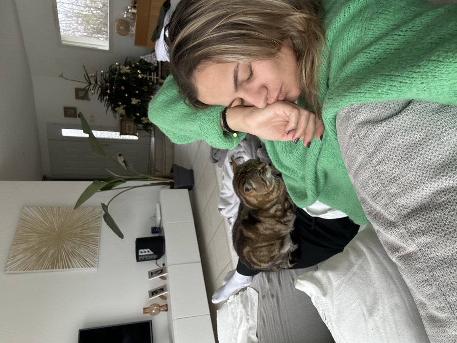 An indoor scene in Veauchette, France, depicts a female individual and a cat resting on a sofa