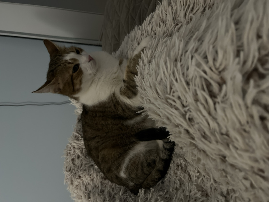 - "A domestic cat, exhibiting a white and brown tabby coat pattern, is depicted lying on a light-colored, long-pile fluffy blanket" by FM-w6tRF2, licensed under CC BY 4.0