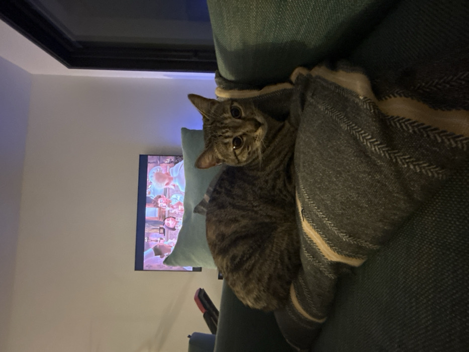 - "A tabby cat rests on a teal couch, nestled between a pillow and a striped throw blanket" by FM-PydNS2, licensed under CC BY 4.0