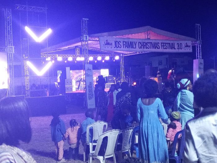 A crowd gathers at night in front of a stage adorned with bright lights. A large banner reads "Jos Family Christmas Festival 3.0." The stage features metal trussing, and speakers are visible. In the foreground, people are seated on white plastic chairs, while others stand, facing the stage. A group of children hold hands. The image is somewhat grainy and has a blueish hue due to the lighting.
