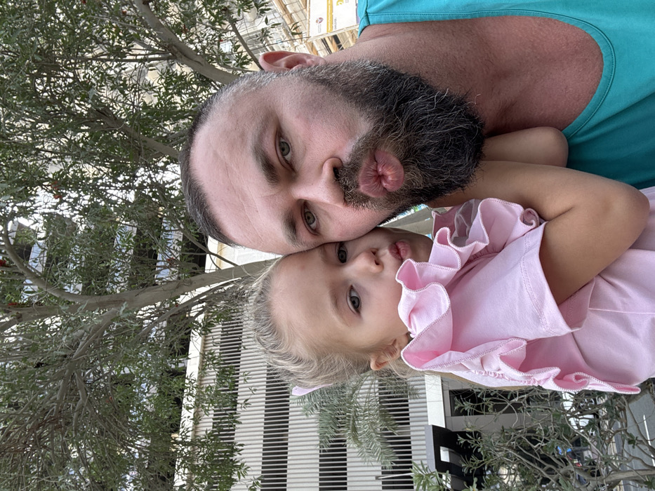 - "A bearded man in a turquoise tank top poses next to a fair-haired child in a pink ruffled shirt" by FM-CnI5F2, licensed under CC BY 4.0