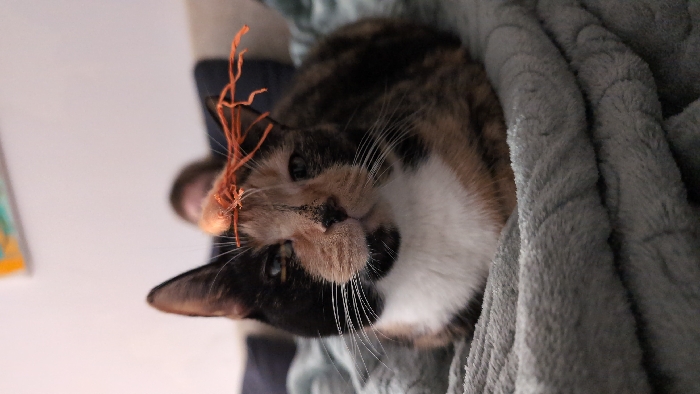 A close-up shot shows a calico cat lying under a gray, textured blanket. The cat has a white chest, black and tan markings on its face, and long white whiskers. A small, orange, twig-like object rests on its forehead. The cat's head is slightly tilted, and it looks directly at the camera with one eye slightly squinted. A blurred human figure appears in the background.