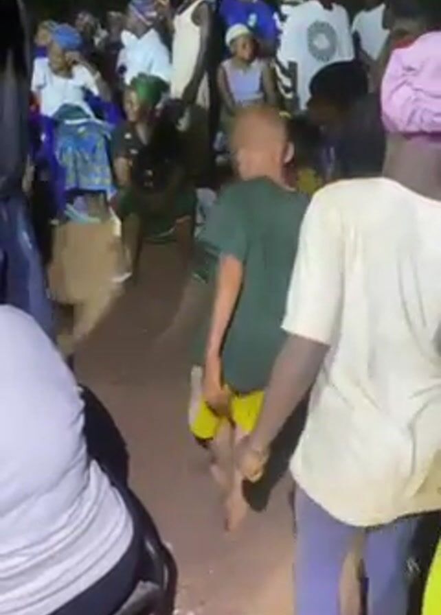 group of people, mostly women and children, gathered outdoors at night. Some are seated on plastic chairs, others are standing or dancing. Several people wear head coverings or hats. Two children dance in the center of the frame. The ground is dirt. The scene is illuminated with artificial light.