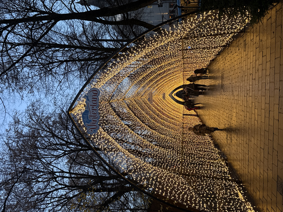 A brightly lit arched walkway, constructed of countless tiny lights, stretches towards the horizon. People stroll through the illuminated tunnel, their figures blurred by motion. Bare tree branches frame the scene against a twilight sky. A sign for "Jul i Vinterland" (Christmas in Winterland) is visible at the entrance. The pathway is paved with bricks, reflecting the warm glow of the overhead lights.