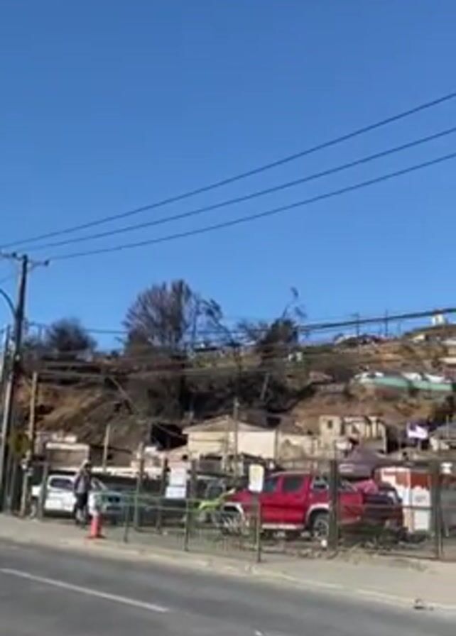 roadside view of a hillside neighborhood ravaged by fire. The sky is clear and bright blue. A two-lane road runs along the bottom of the frame. On the far side of the road, the lower parts of buildings and trees are visible. On the hill, scorched remains of buildings and trees are visible, and a few structures are still standing. Burned vegetation and debris cover the hillside. Utility poles and power lines are visible, as well as fencing and other roadside objects. People are walking on the side of the road. Several vehicles are parked or moving nearby.