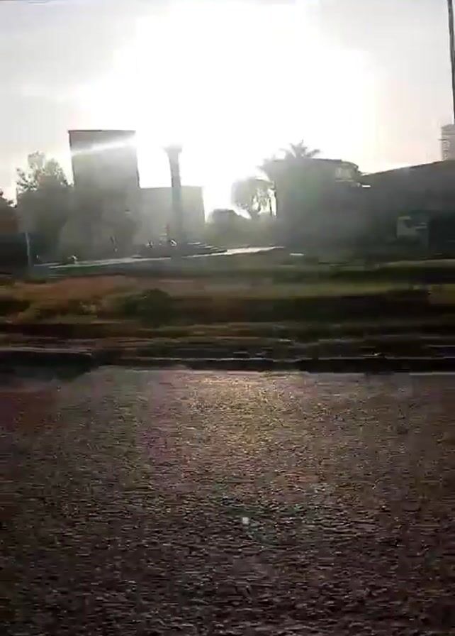 The video depicts an urban landscape, likely a city street or intersection, during what appears to be early morning or late afternoon due to the bright sun situated low on the horizon, causing lens flare. The road in the foreground is paved and slightly reflective, possibly wet. In the background, there are buildings of varying sizes, including some taller structures that might be apartment buildings or offices. There is greenery present in the scene, suggesting the presence of parks or landscaped areas. Tall palm trees can be seen, emphasizing the location might be tropical or subtropical. Vehicles, including cars and motorcycles, are observed moving along the road. There's a streetlight with signage visible on the side of the road. The overall scene is one of a city waking up or winding down with normal traffic activity.