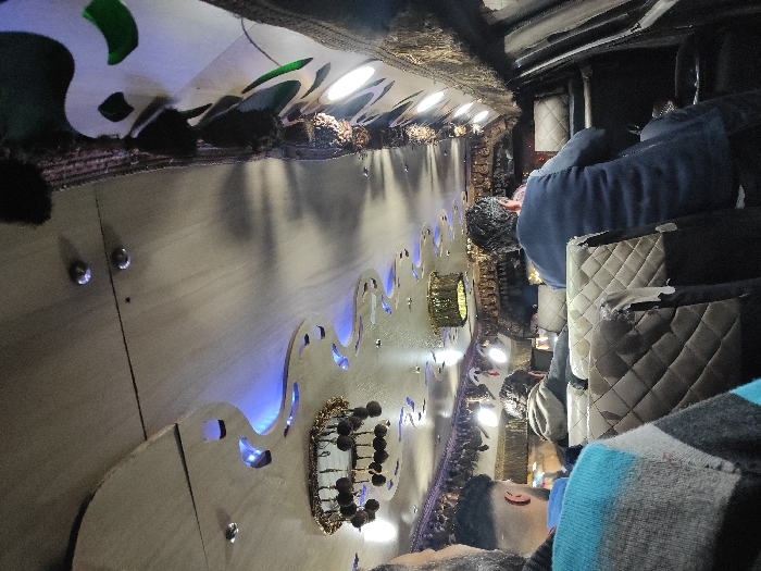 inside of a vehicle, possibly a van or bus, with ornate interior design. The ceiling has cut-out shapes with blue and white lighting. Embellishments line the edges, and decorative metal pieces adorn the walls. People are seated on upholstered benches or seats, and overhead storage is visible. The overall aesthetic leans towards a customized, luxurious mobile space.