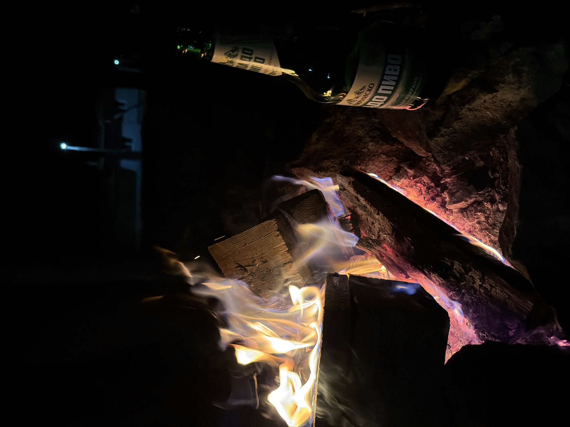 The scene depicts an outdoor night setting in Tutrakantsi, Bulgaria. A contained campfire occupies the left side of the frame, featuring multiple logs in various stages of combustion. Flames emanating from the logs display dominant hues of orange, yellow, and blue, with incandescent red glowing from deeper within the wood. To the right, a green glass bottle rests vertically on a dark, uneven surface. Its label prominently displays the Cyrillic text "ПИРИНСКО ДО ПИВО" (Pirinsko Beer). The background is dark and out of focus, containing two distant, distinct sources of blue-green artificial light, consistent with streetlights, and indistinct blurry shapes suggestive of urban structures. No individuals are visible within the frame.