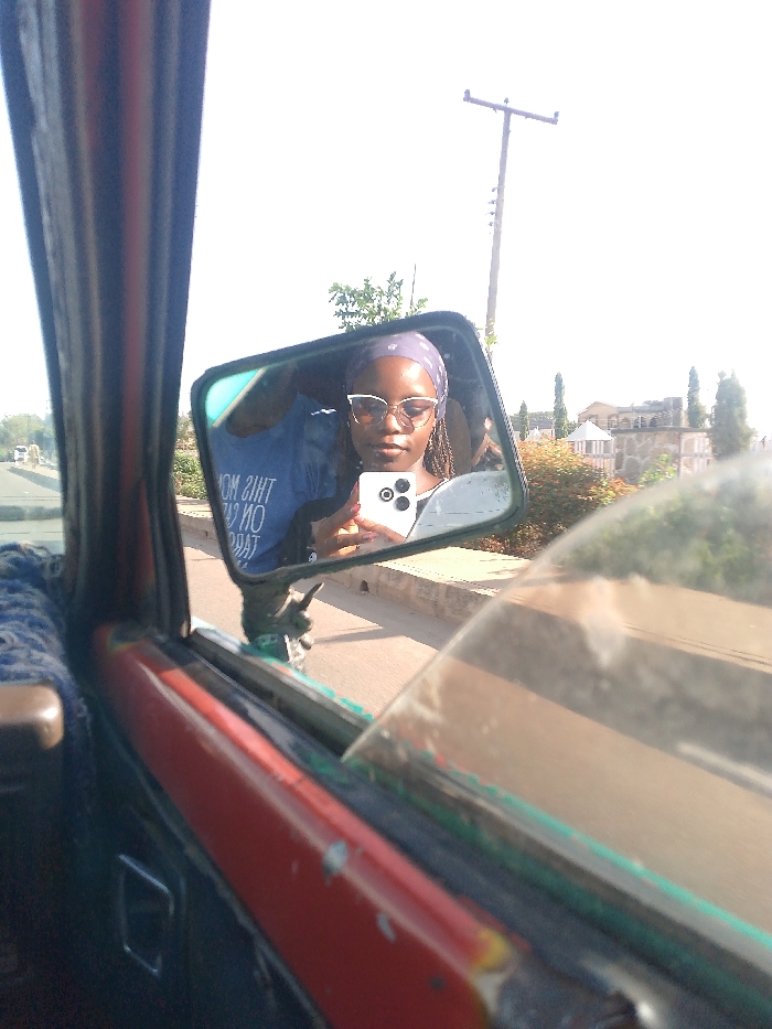 The image captures a scene from inside a vehicle in Bukuru, Nigeria, looking out towards an external passenger-side mirror