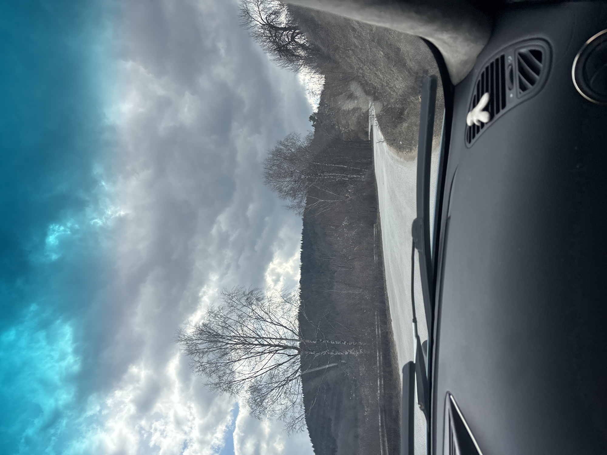 The image presents a view from the interior of a vehicle traveling on a paved road in Teshel, Bulgaria. The black dashboard and windshield wipers are prominent in the immediate foreground. A small, white, roughly humanoid-shaped object rests on the passenger-side air vent, positioned above a circular speaker grille partially visible at the bottom right. The two-lane road curves gently to the right and extends into the middle distance, appearing dry. On the left side of the road, several tall, leafless birch trees with distinct white bark stand prominently against a backdrop of heavily forested hills. The right side of the road features a steep, earthen embankment covered with sparse, dry vegetation and several bare, gnarled trees. The sky is largely overcast with extensive grey clouds, though patches of brighter light indicate the sun breaking through in places. A distinct, vivid turquoise band of sky is visible at the very top of the frame, possibly an optical effect or reflection. The overall environment suggests a late winter or early spring season due to the deciduous trees being devoid of foliage. No individuals are visible outside the vehicle, and no direct interactions are depicted.