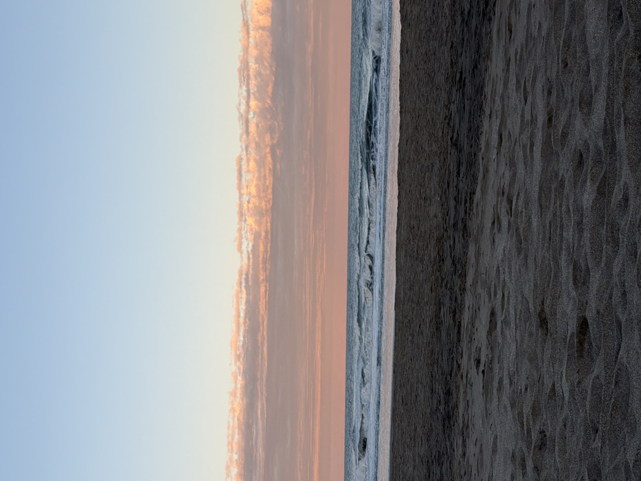 The image depicts a tranquil coastal scene in Pinamar, Argentina, at what appears to be either sunrise or sunset. The frame is horizontally divided into three primary sections: sky, ocean, and beach. The upper third features a clear, light blue sky that transitions downwards into a soft pink-orange hue, indicative of low sun angles. Below this, a distinct band of horizontally stretched, cumulus-like clouds, illuminated with a warm orange glow, spans the mid-sky. The central portion of the image displays the ocean, characterized by a grey-blue color with multiple white-capped waves breaking and receding towards the shore. The lowest third of the image is comprised of the dark, damp sand of the beach, showing undulations and variations in texture from footprints or natural erosion. No people, discernible objects, or signs of human activity or interaction are present within the frame.