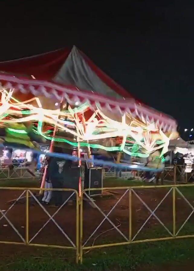 At night, a carnival carousel is in motion, adorned with bright, colorful lights
