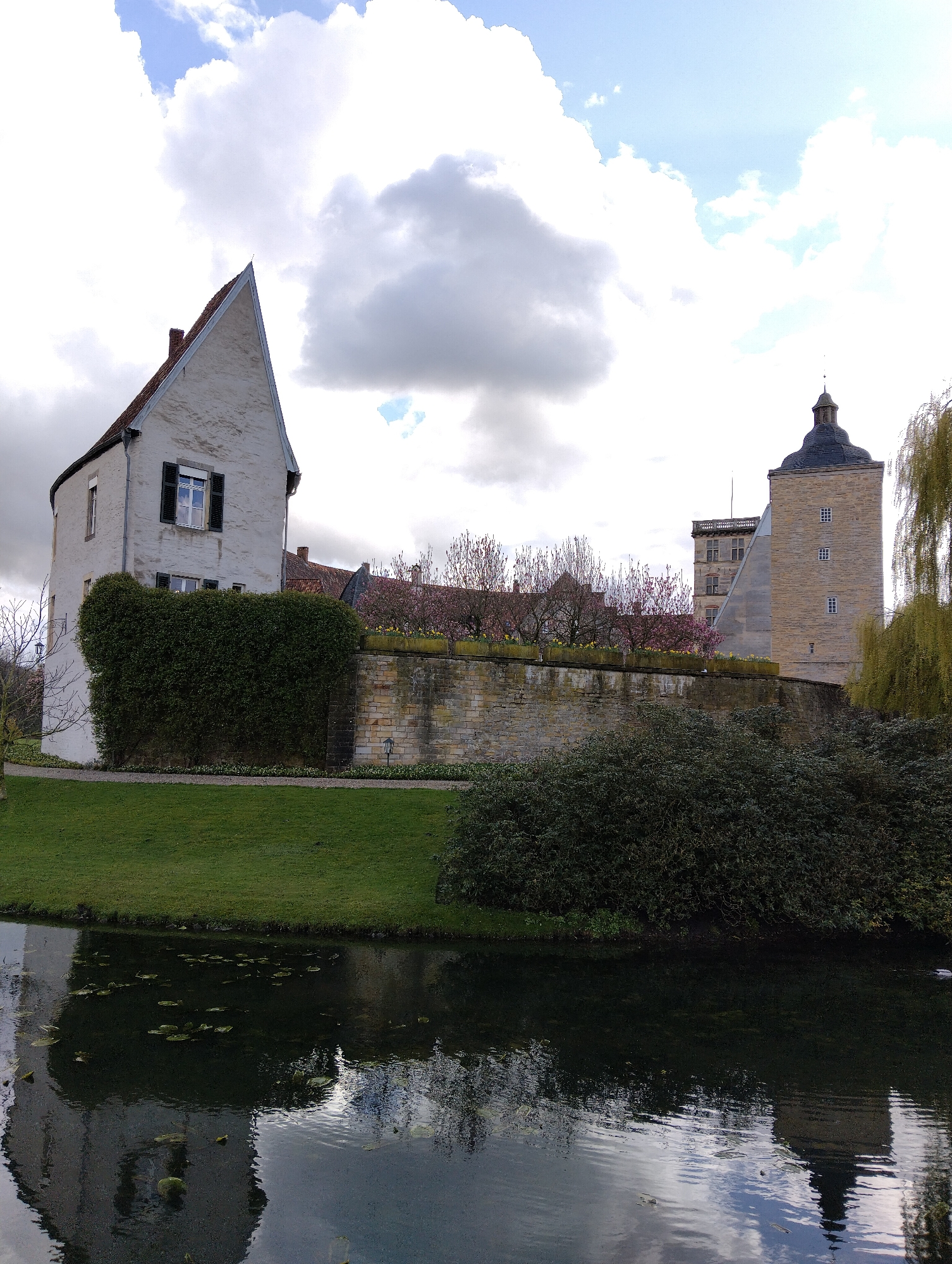 The image depicts a static architectural and natural scene in Burgsteinfurt, Germany, showcasing parts of Steinfurt Castle and its surrounding landscape. In the foreground, a dark, calm body of water, likely a moat or pond, occupies the lower third of the frame. Its surface reflects the sky and adjacent structures, and several green lily pads are dispersed across it. A strip of vibrant green grass borders the water on the left, leading to a narrow gravel path. To the left, a multi-story building with white stuccoed walls and a steeply pitched, reddish-brown tiled gable roof stands prominently. A dark chimney is visible on the roofline. The facade features at least one window on the upper floor with dark green louvered shutters. The lower portion of this building's facade is obscured by a dense, manicured green hedge that extends horizontally along a light-colored stone retaining wall. The stone retaining wall, constructed from irregularly shaped blocks, runs horizontally across the midground, delineating a raised terrace area. Above this wall, on the terrace, several trees display early spring blossoms, including clusters of pink flowers and individual yellow blooms. On the right side of the image, behind the retaining wall, a substantial square tower of light-colored stone construction rises. It is capped with a dark, multi-tiered, onion-shaped cupola. The tower's facade contains several small, square-paned windows. Behind this tower, sections of another light-colored stone building with an angular roofline are visible. A large weeping willow with delicate light green foliage hangs into the frame from the far right, partially overhanging the water. Dark green shrubs are also present near the water's edge on the right. The sky is partially overcast, featuring a mix of large white and gray cumulus clouds, with intermittent patches of clear blue sky. No human figures or discernible activity are present in the scene.
