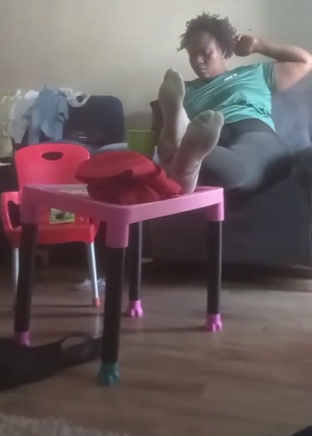 A person is lying on a couch with their socked feet elevated on a pink and black child's table