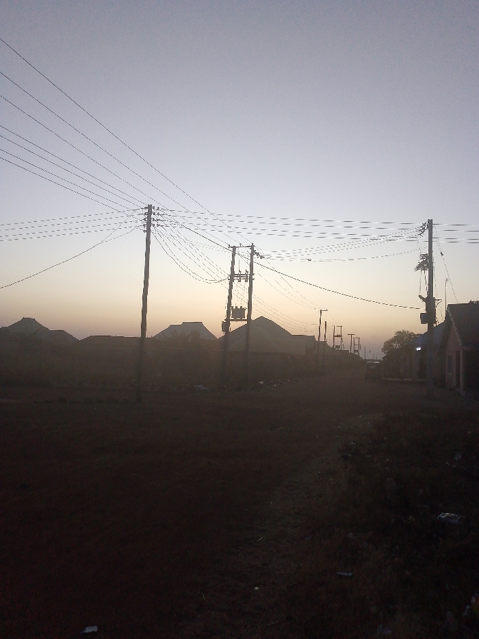 A dirt road stretches into the distance, flanked by simple houses. Power lines crisscross the sky, supported by wooden poles. The setting sun casts a warm glow, silhouetting the buildings and poles against the fading light. The scene evokes a sense of rural simplicity and quietude.