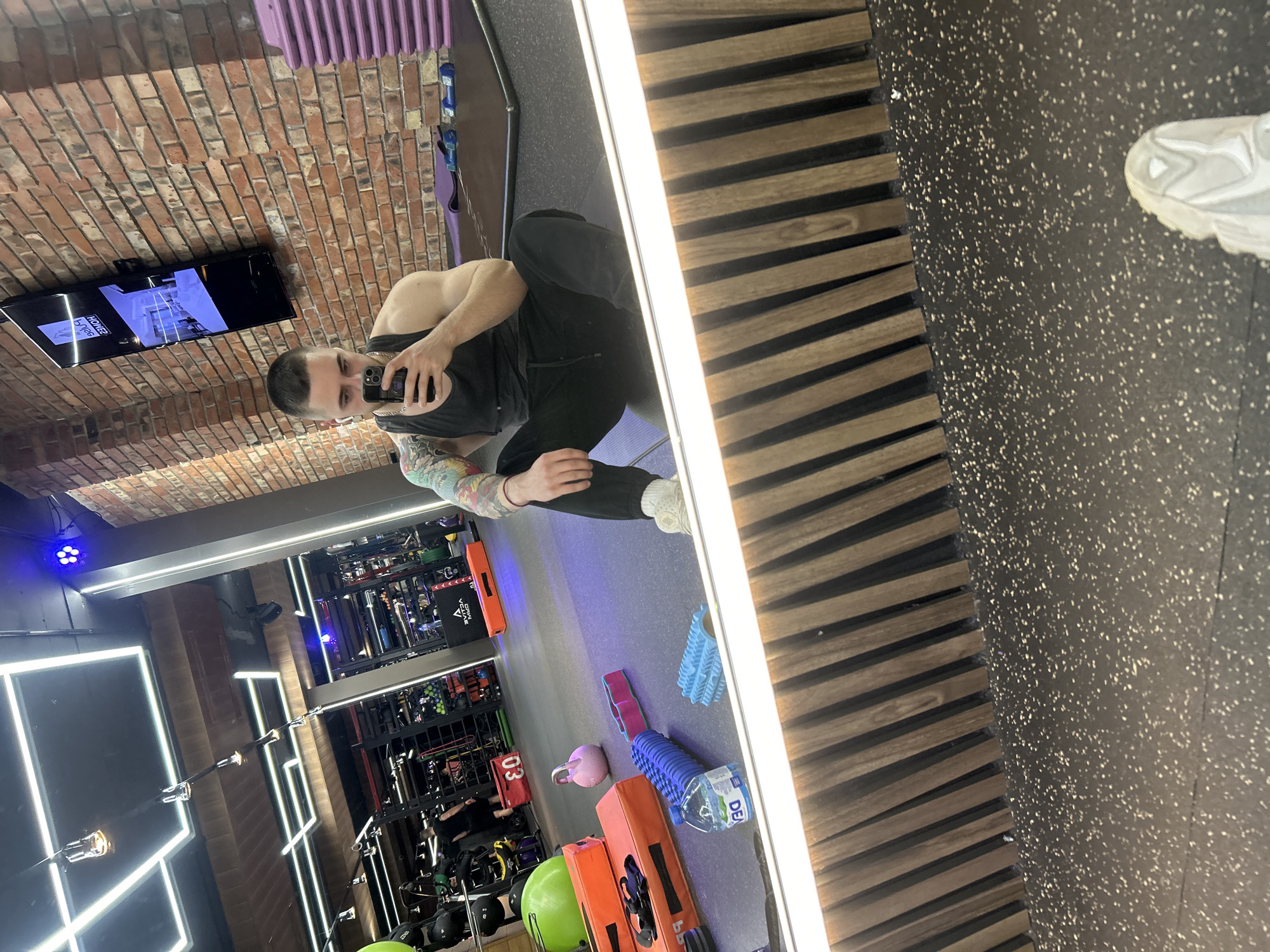 The image captures a mirror selfie taken inside a modern fitness center, identified as being in Sofia, Bulgaria, based on the visible "DEVIN" water bottle brand and other contextual clues. A male individual, with short hair and a full sleeve tattoo on his left arm, is seated cross-legged on a dark speckled rubber floor, facing a large, illuminated mirror. He wears a black tank top, black pants, and white socks, with white wireless earbuds inserted in his ears, and holds a dark-colored smartphone to capture his reflection. The mirror's bottom edge features a horizontal LED light strip and a decorative frame of vertical wooden slats. The gym's interior includes exposed brick walls on the right and a dark ceiling outfitted with geometric white LED strip lighting and multiple pendant lamps. Blue accent lights are also visible. Various fitness equipment is scattered across the floor and arranged in the background. Immediately in front of the mirror are a bottle of Devin mineral water, a blue foam roller, and a light blue textured roller. Reflected on the floor behind the individual are a green exercise ball, two orange crash pads (one marked "EO", another "99"), a pink kettlebell, a pink step board, a stack of purple aerobic steps, a purple yoga mat, and two small blue dumbbells. A large flat-screen television mounted on the brick wall displays "ARES HOMES" branding and interior real estate photographs. Extensive gym equipment racks, including weights, medicine balls, and specialized training apparatus, are visible further in the background, where another person is partially seen walking. A prominent black structure bearing "AVIVA MED" (reversed) is also part of the gym's setup.