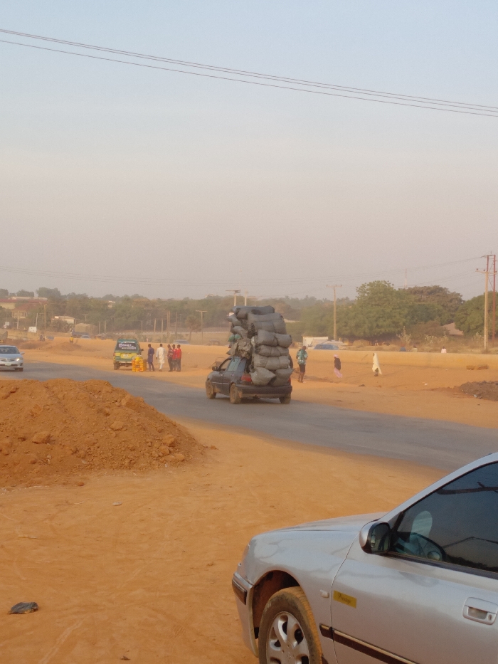 This image depicts a dusty roadside scene in Kakau, Nigeria, under a hazy, pale sky