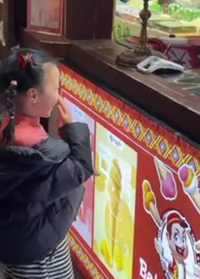 A young girl in a black puffer jacket and striped pants stands at a Turkish ice cream stand