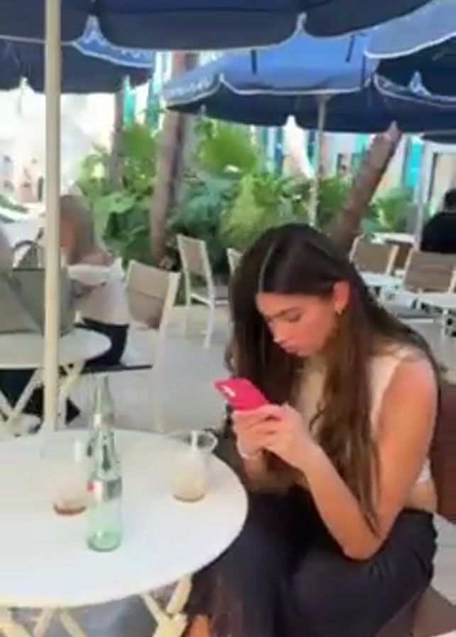 n outdoor cafe scene. A young woman with long brown hair sits at a small round white table, looking at a pink mobile phone. She wears a light-colored top and a long black skirt with lace trim. On the table are a glass, a bottle of water, and what looks like a soy sauce bottle. The camera pans up to show other people seated at similar tables under blue umbrellas. Palm trees fill the background under a bright blue sky. The location is sunny and tropical.