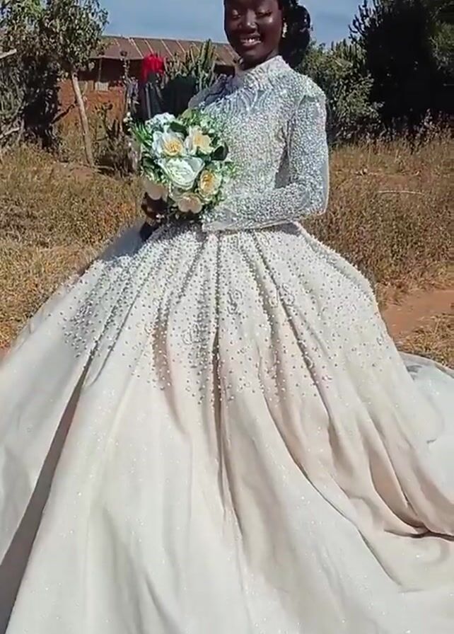A young Black woman in a white, long-sleeved wedding gown stands in a grassy field with a bouquet in her hands. The gown has a full skirt adorned with beading. Behind her is a modest brick building with clothes hanging on a line. The sky is blue and cloudless. She looks at the bouquet and then looks up and smiles.