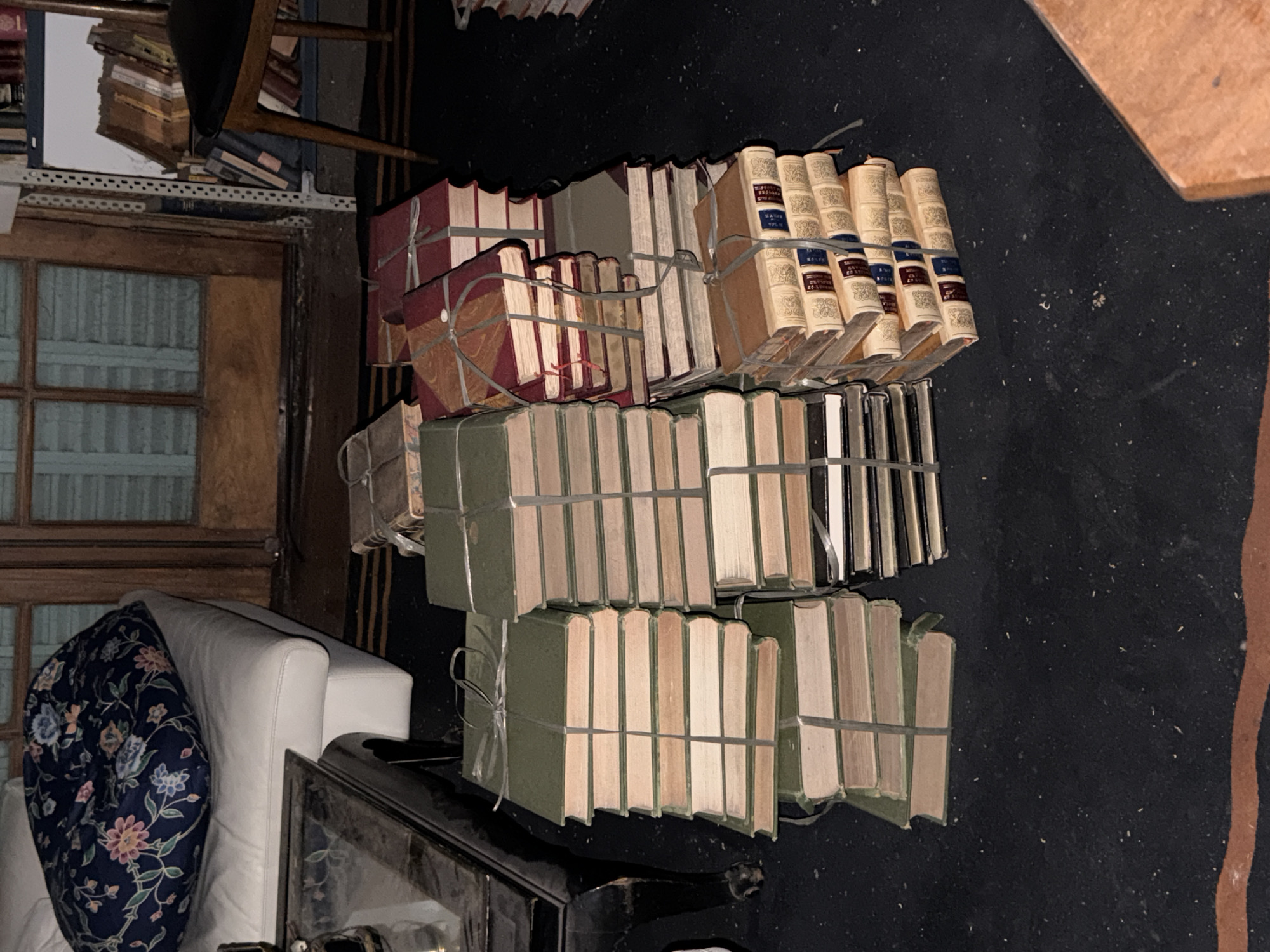 The image depicts a cluttered interior, likely a private residence, in Buenos Aires, Argentina. The primary focus is on three stacks of books, each bound together with string. The top stack features books with red, brown, and beige covers. The middle stack is composed of books with greenish-grey covers. The bottom stack also features greenish-grey covered books. In the background, a window is visible, along with shelves laden with more books, and the corner of a white upholstered chair with a dark floral cushion. The overall impression is one of a room filled with books and other items. The black carpet suggests a dimly lit environment.