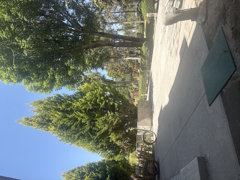 The image depicts an outdoor scene within a park or public square in San Andrés Cholula, Mexico, under clear, bright daylight. The foreground consists of a concrete paved surface, partially covered by distinct shadows cast by unseen structures to the left, indicating strong sunlight. A dark green, rectangular metal plate with a textured surface, possibly an access panel, lies on the concrete in the immediate foreground, slightly askew. To the left, a raised concrete step or edge is visible. In the mid-ground, a three-wheeled cargo bicycle, featuring an orange frame and a large rear cargo area with a metal framework, is parked on the paved surface. Adjacent to the bicycle is a low, rectangular concrete planter or wall. The scene is dominated by dense vegetation. On the left side of the frame, several tall, conical evergreen trees with rich green foliage stand prominently against a clear blue sky. Towards the right, taller deciduous trees with lighter green leaves are visible, casting shadows across the paved area. In the background, a landscaped garden area is visible beyond the paved surface, featuring trimmed green hedges, some reddish flowering plants or decorative elements, and several spiky cactus plants. Low, carved stone bollards or decorative posts delineate the edge of the paved area from the landscaped section. No people are present, and no actions or interactions are depicted within the frame.
