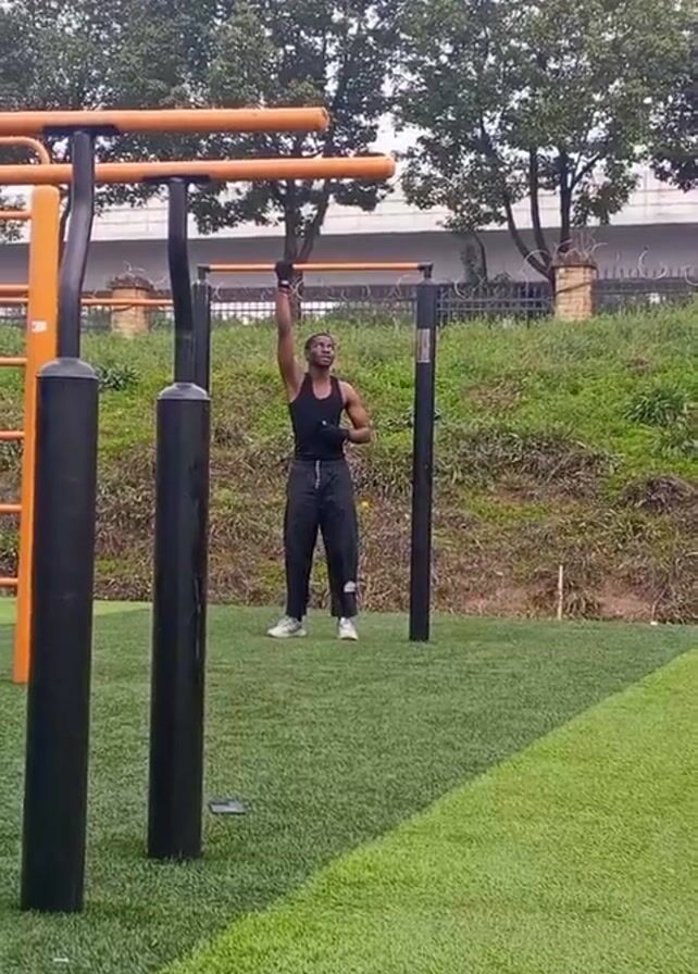 Black male in a black tank top and dark sweatpants doing pull-ups on a metal bar set in an outdoor exercise area