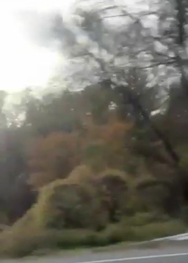 roadside view of trees, viewed through a window. The trees are dense with various shades of green, yellow, and brown, typical of autumn. Some of the trees have bare branches against a cloudy, overcast sky. A gray guardrail runs parallel to the road, which is asphalt with visible lane markers. The perspective suggests the video was taken from a moving vehicle.