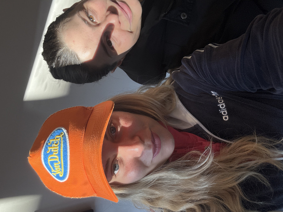 This image captures two individuals indoors in Roubaix, France. On the left, a fair-skinned female with long blonde hair and blue-green eyes wears an orange Von Dutch trucker hat, a red collar, and a dark blue or black Adidas zip-up track jacket with white stripes on the sleeves and a white "adidas" logo on the chest. She looks directly at the camera with a subtle smile, her face illuminated by direct sunlight. To her right, a second fair-skinned female with dark hair pulled back, visible brown eyes, and a warm smile, also looks towards the camera. She wears a dark jacket, possibly a puffer style. Her face is partially obscured by shadow, with a distinct strip of sunlight diagonally across her forehead and nose. Both individuals are positioned closely together, suggesting a selfie or close-up portrait. The background is a plain, light-colored wall, displaying sharp patterns of sunlight and shadow.