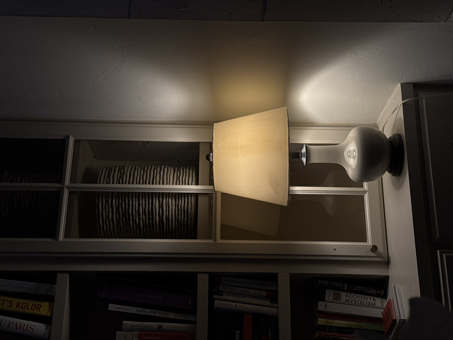 - "A wall-mounted lamp with a beige lampshade illuminates a built-in bookshelf" by FM-cO6sC3, licensed under CC BY 4.0